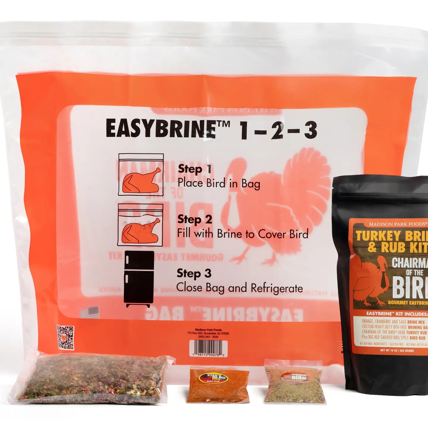 All new for the best selling Chairman of the Bird brand - Thanksgiving Turkey Brine Kit with Bag and Seasoning Rub. Kit includes Brine Mix, Seasoning Rub and Brining Bag. Enough for turkeys and poultry up to 30 LBS.