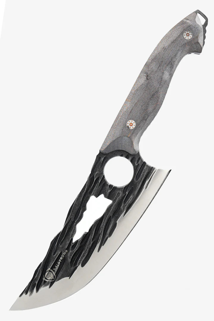 The best of the Chef Knife, Utility Knife, and Hunting Knife in one ultra-versatile, tough blade. The in-blade grip hole allows an extra grip for pulling through flesh and skinning game. Forged from ultra-durable steel and a textured wood handle for a visceral cooking experience.